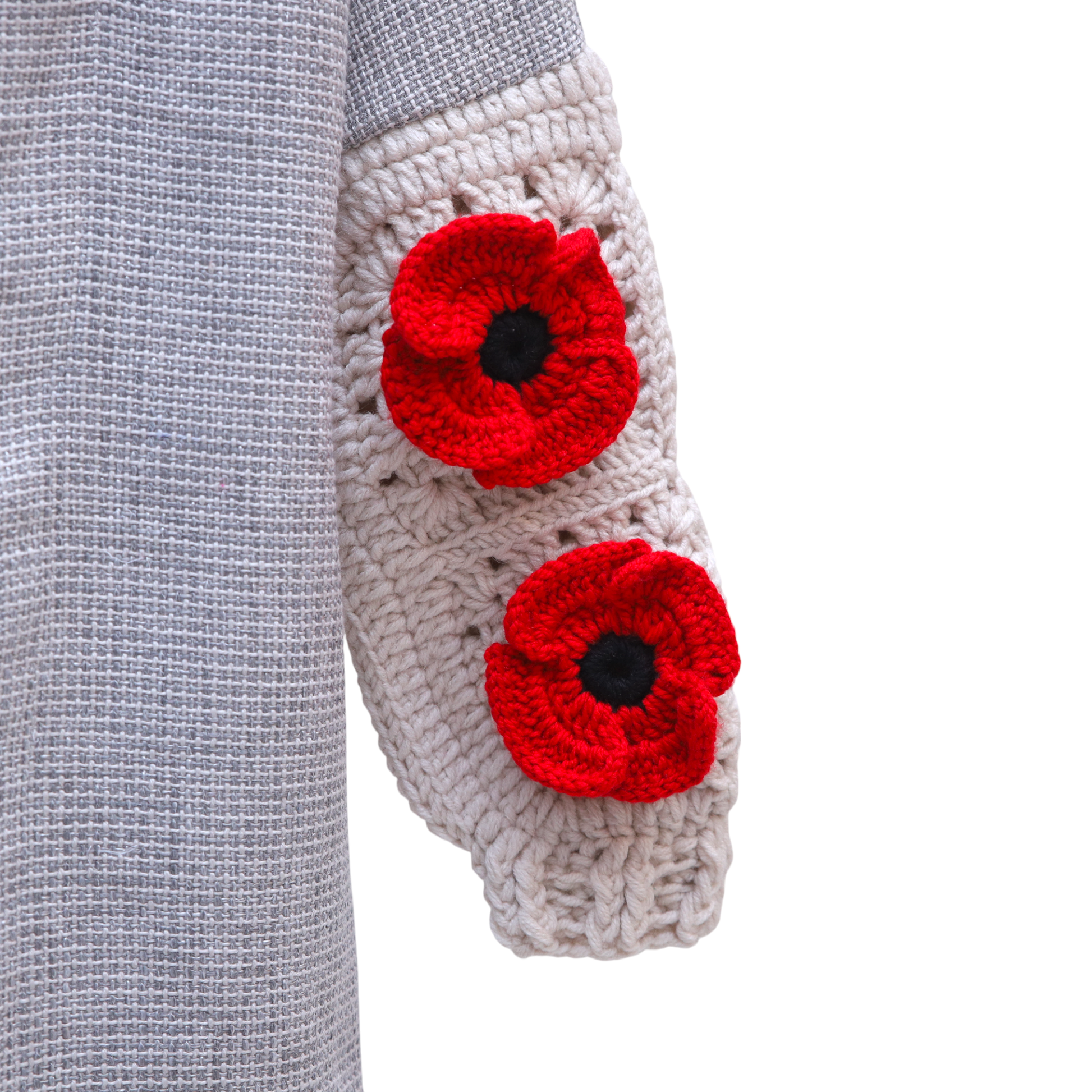 - color: Light grey Jacket With hand knitted Sleeves.