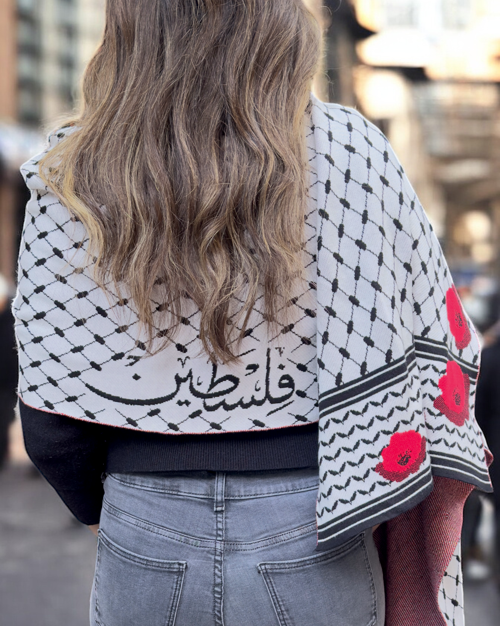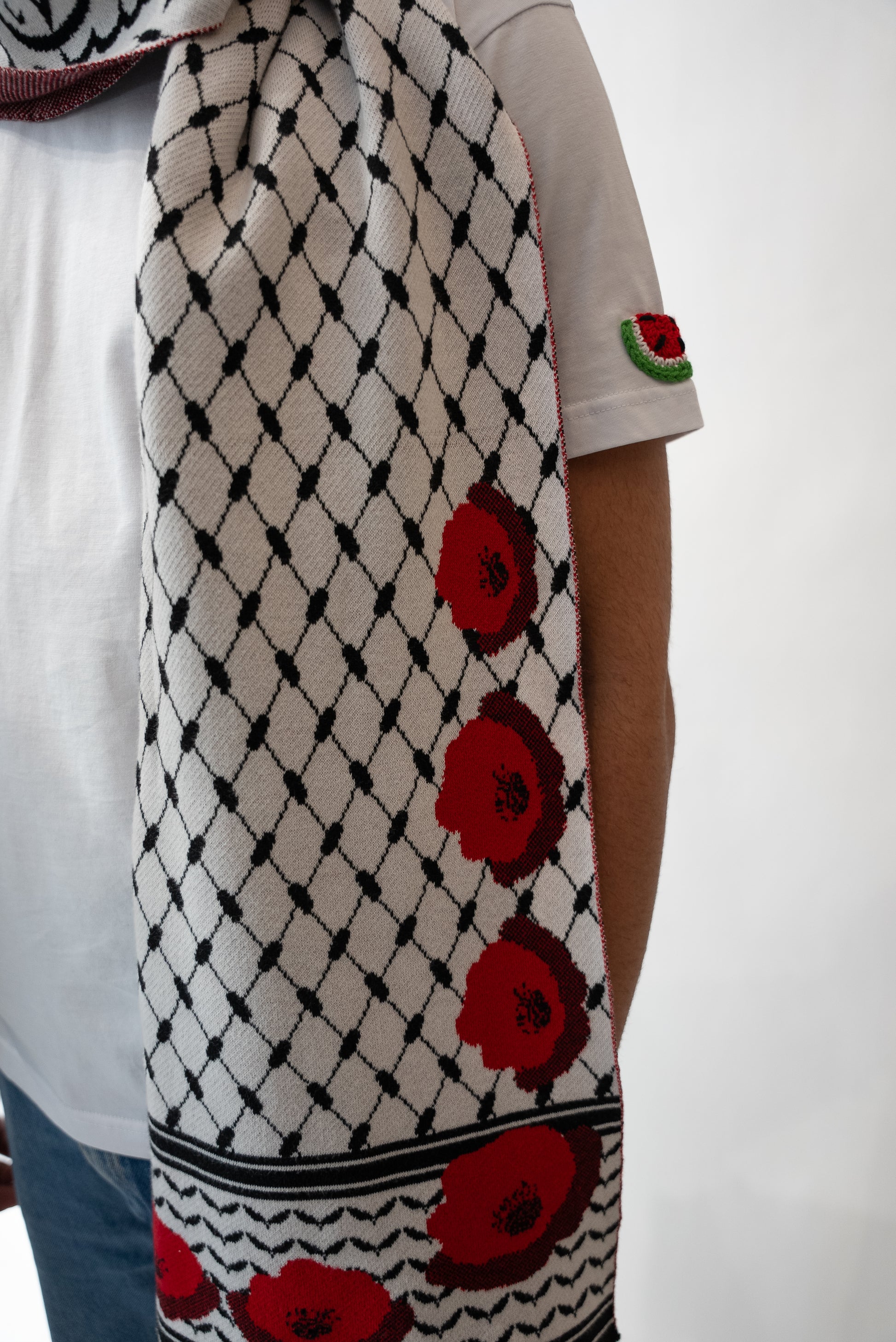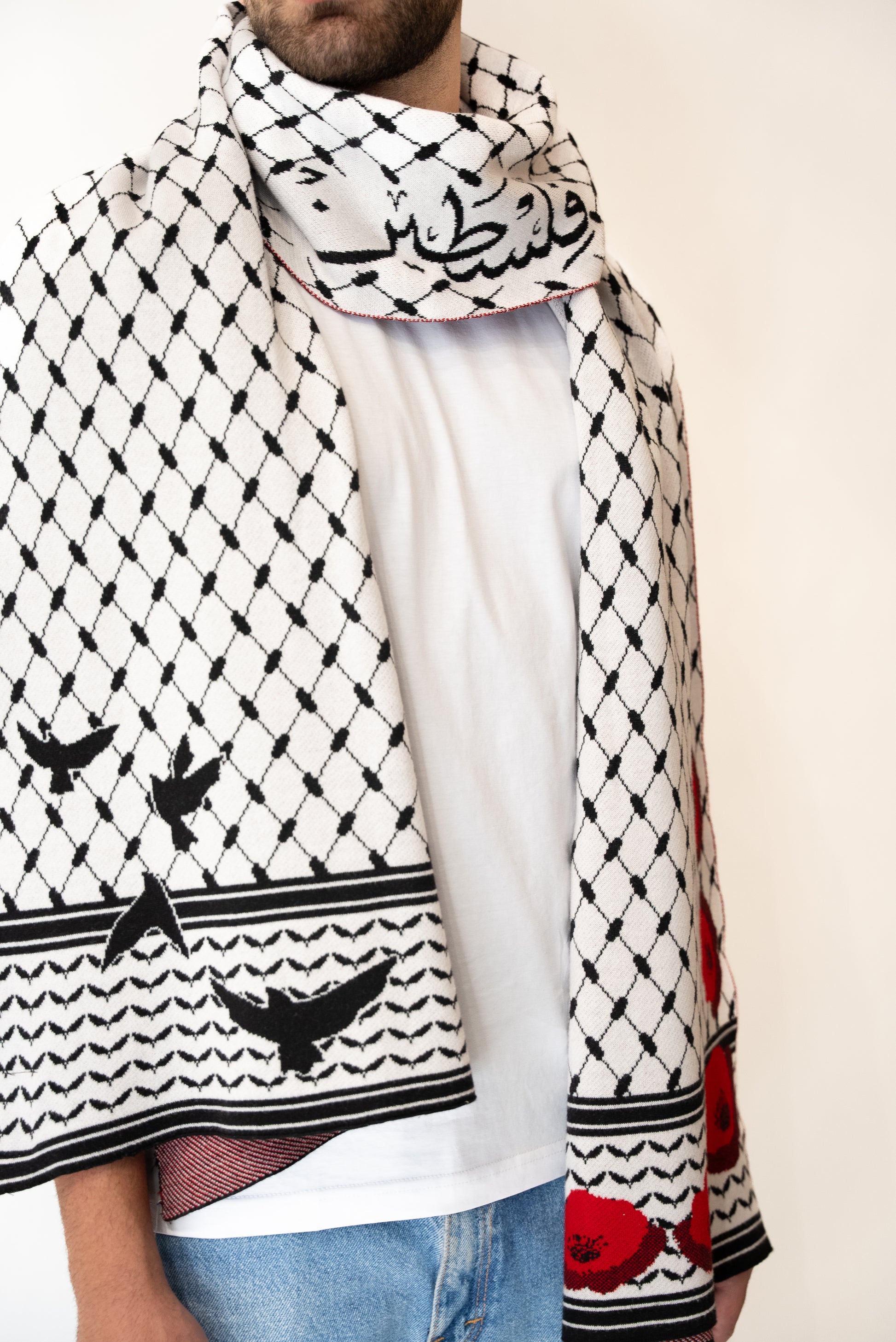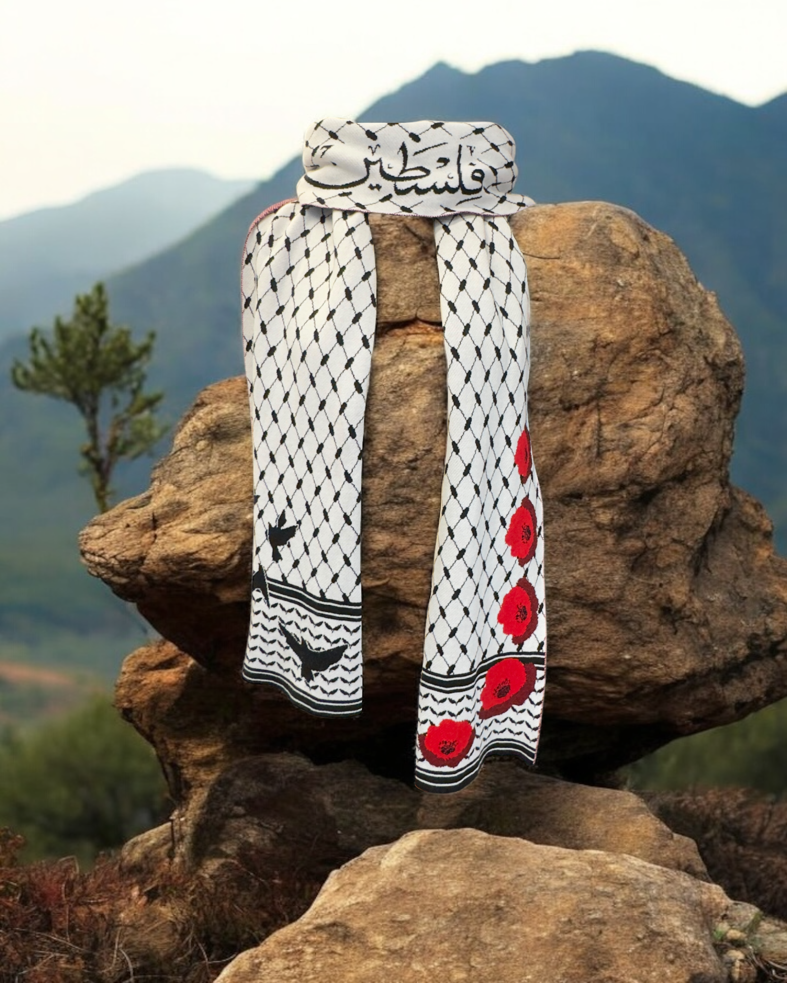 - Our special limited edition design of Palestinian Kuffeyeh featuring Dahnoun red flowers and birds.