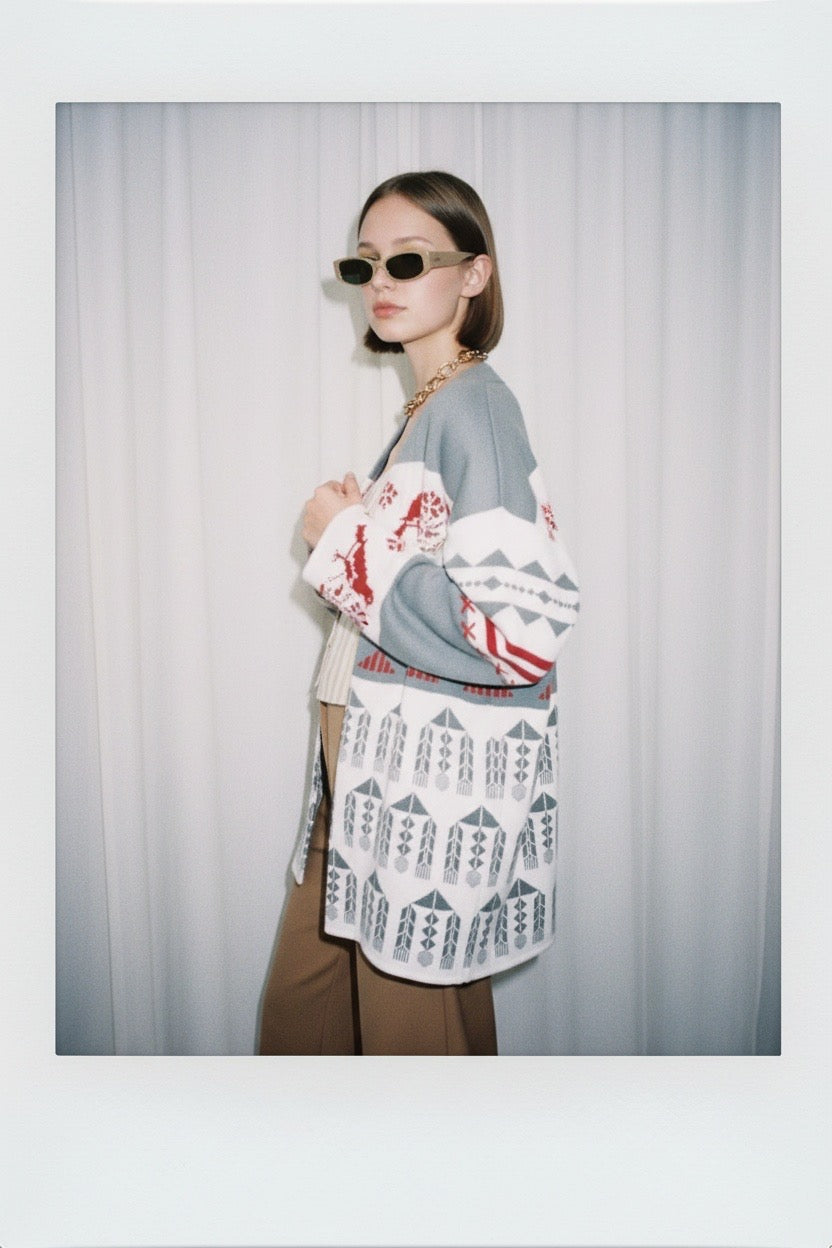 This kimono carries the delicate birds of freedom and intricate Palestinian embroidery patterns, reimagined in soft tones of grey, ivory, and red. Designed for effortless layering, it blends heritage artistry with a modern silhouette—wrapping you in culture, memory, and timeless style.