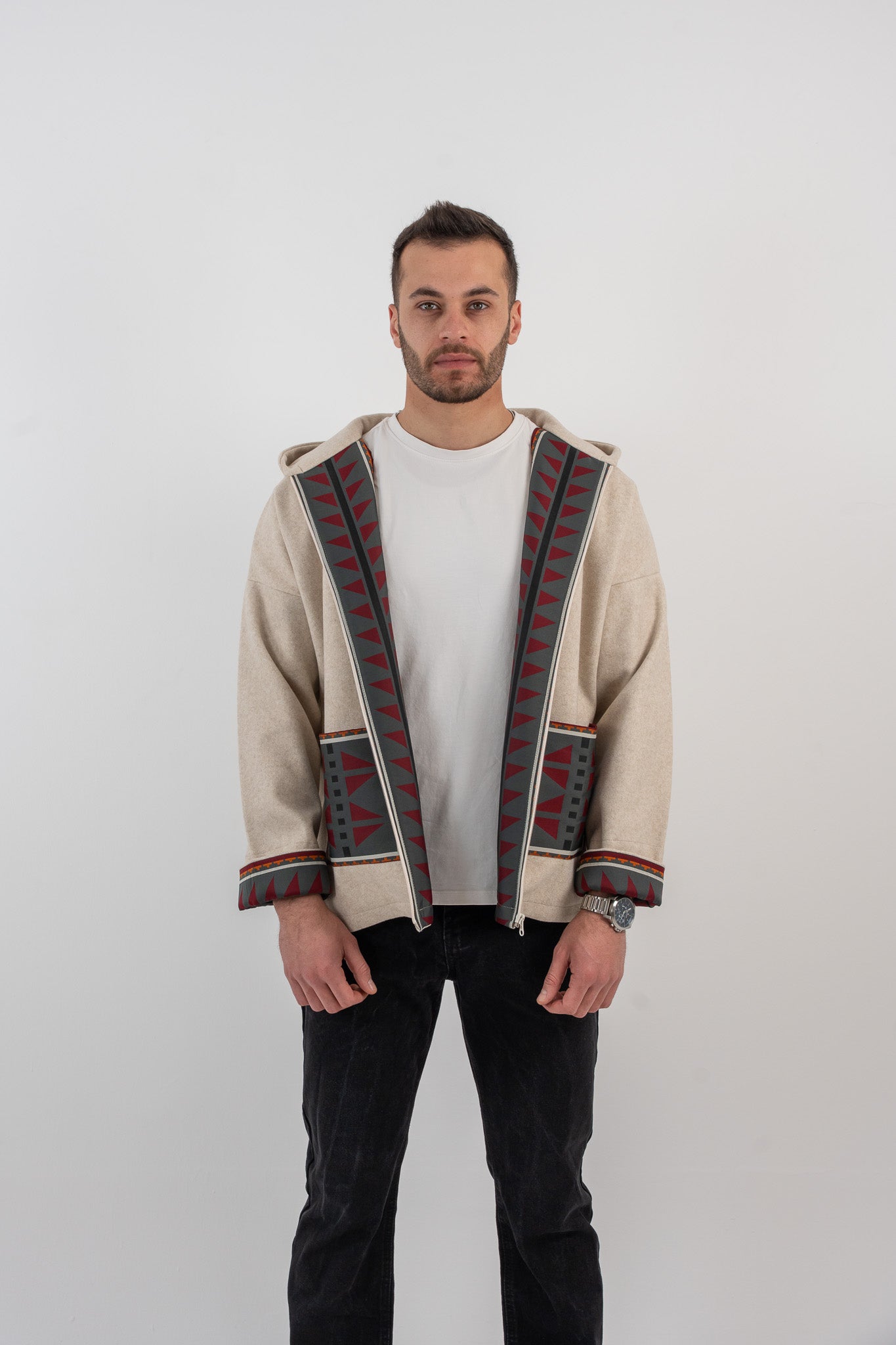 Designed with a clean, structured silhouette and subtle cultural detailing, this unisex jacket balances modern streetwear with heritage elements. The contrast trims and woven accents add depth without overpowering the form.