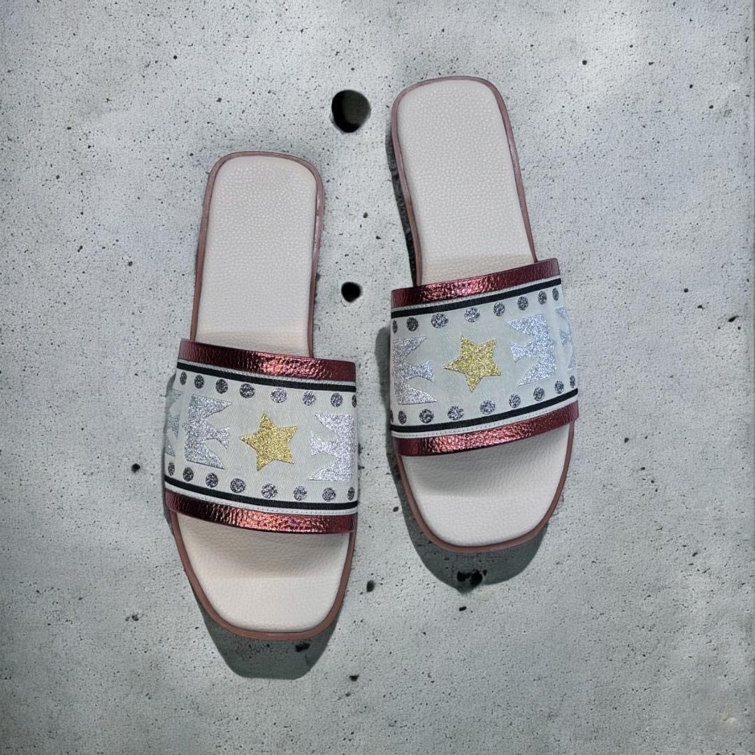 Handcrafted with a gleam of glam and a nod to symbolism, these Star Struck Slides feature shimmering golden stars, metallic silver doves, and bold burgundy edges. Lightweight yet striking, they’re designed for the ones who walk with flair and purpose.