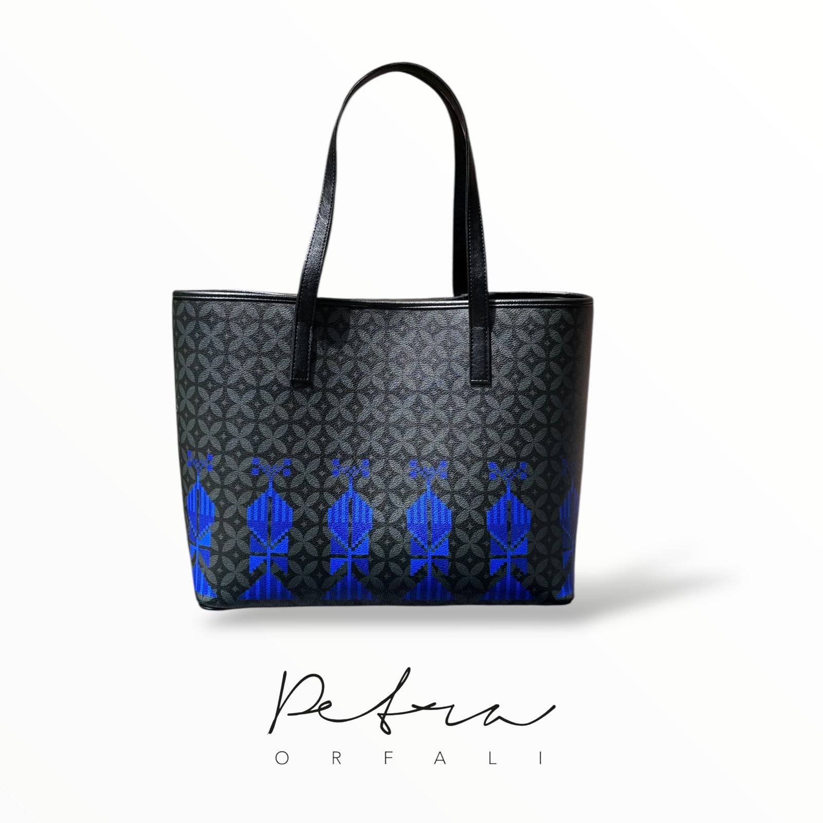 - The Bahja Tote in black with vivid blue embroidery is a powerful expression of modern design. Its deep tones contrasted with vibrant heritage-inspired motifs create a striking accessory that embodies confidence, creativity, and individuality.
