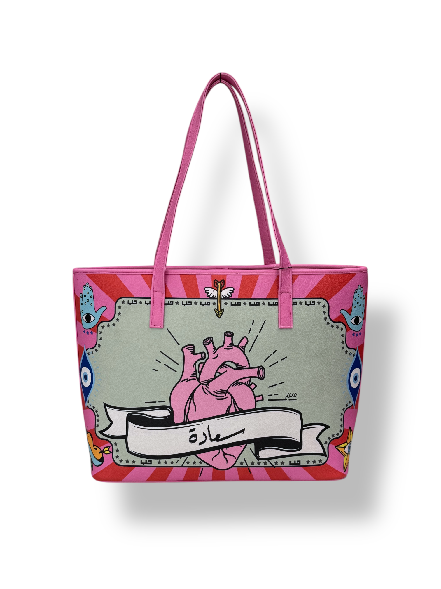 Digitally printed on soft leather, this bag carries the Arabic word سعادة — happiness — surrounded by playful motifs and energy symbols that speak to her creative spirit.