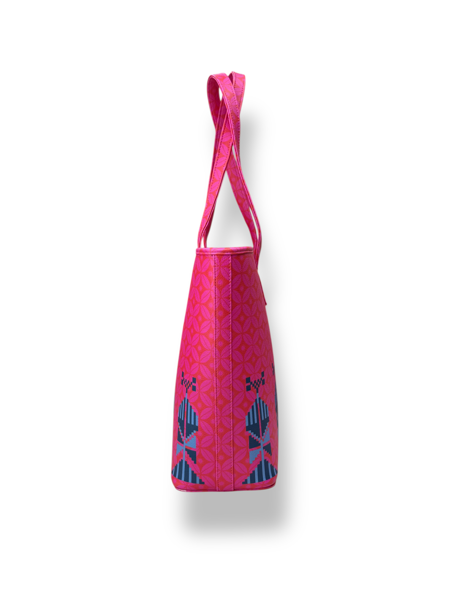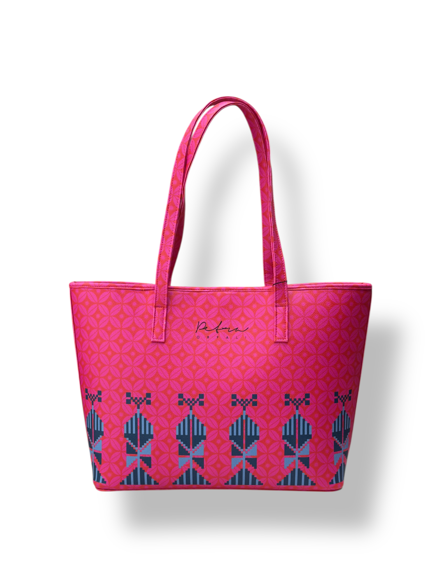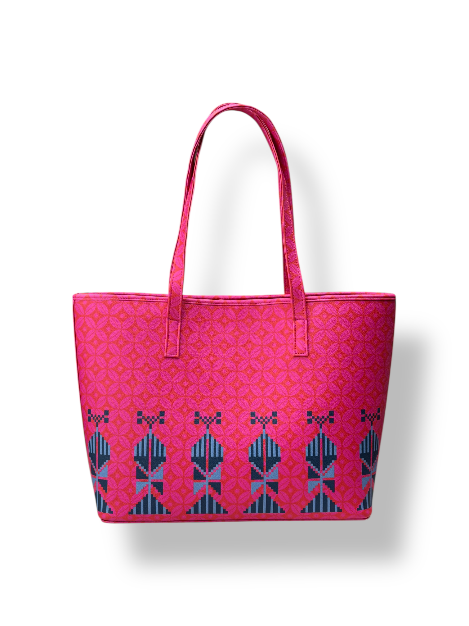 Crafted from digitally printed leather, the Bahja tote draws its pattern from the ornamental bricks found across buildings in Jabal Amman — a visual rhythm deeply embedded in the city’s heart. The joyful pink palette breathes new life into this timeless motif, transforming concrete memory into wearable art.